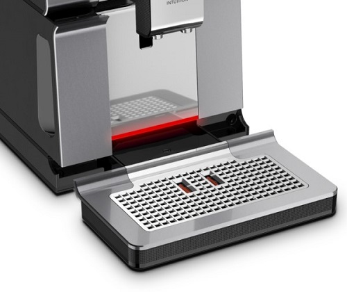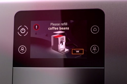 The intuitive light indicator, above the drip tray, lights up in red and a message will appear on the display asking you to fill the coffee bean container or the water tank.
